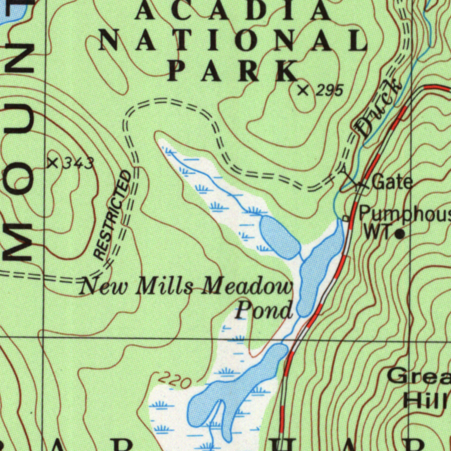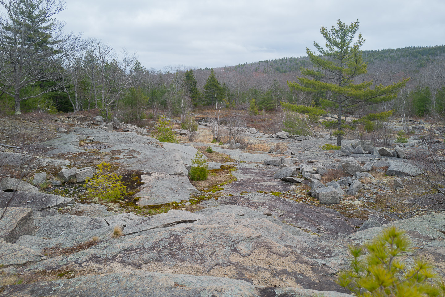Although I’m not certain, I’m pretty sure that this land was part of Acadia National Park by at least 1940, which means that if it were an active quarry earlier, workings had stopped by the 1942 map. It seems reasonable that enough relics were left over in 1956 to continue showing it on the map, but probably by 1982, it was in a state similar to what it is today: once a quarry, but now long-abdandoned.
